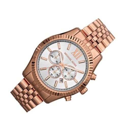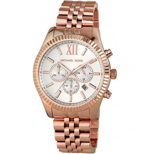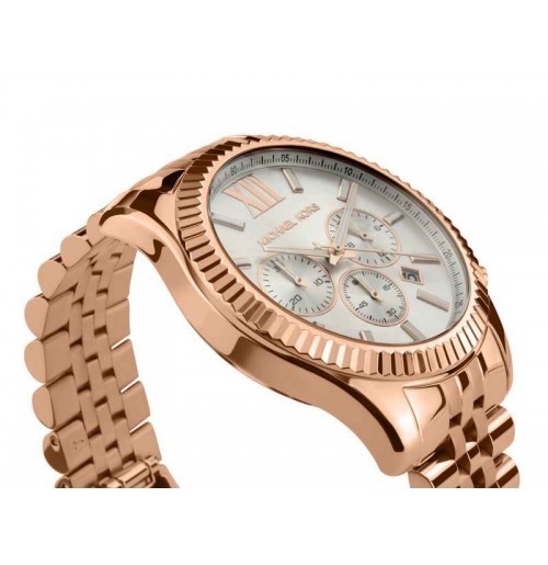 A textural topring adds eye-catching appeal to the rose gold-tone stainless steel Lexington chronograph watch.
