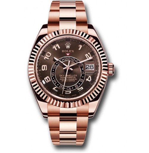42mm Everose gold case, bidirectional rotatable ring command bezel, chocolate sunray dial, automatic Rolex caliber 9001 movement, second time-zone displayed via off-center rotating disc, Saros annual calendar with date at 3 o'clock and month indicated in discrete apertures at each of the 12 hour marks, 18K Everose gold Oyster bracelet with Oysterclasp and Easylink extension link. Water resistant to 100 meters.